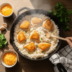 This cheesy chicken rice recipe is pure comfort food at its finest. Imagine perfectly seasoned chicken combined with rice that’s cooked to perfection in a rich, savory broth, then finished with melted cheese that creates those gorgeous, stretchy cheese pulls we all love. It’s a complete meal in one pan—protein, carbs, and plenty of flavor all working together in perfect harmony.