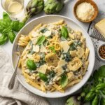 A: Definitely! This pasta is incredibly versatile for protein additions. Cooked chicken breast (about 2 cups, diced or shredded) is the most popular choice – rotisserie chicken makes it super easy. Cooked shrimp (1 pound) stirred in at the end stays tender and adds elegant flavor. Crumbled Italian sausage (about 1 pound, browned) makes it heartier and adds spicy notes. Even crispy bacon or pancetta crumbled on top adds wonderful smoky flavor. Just add your chosen protein when you add the spinach and artichokes.