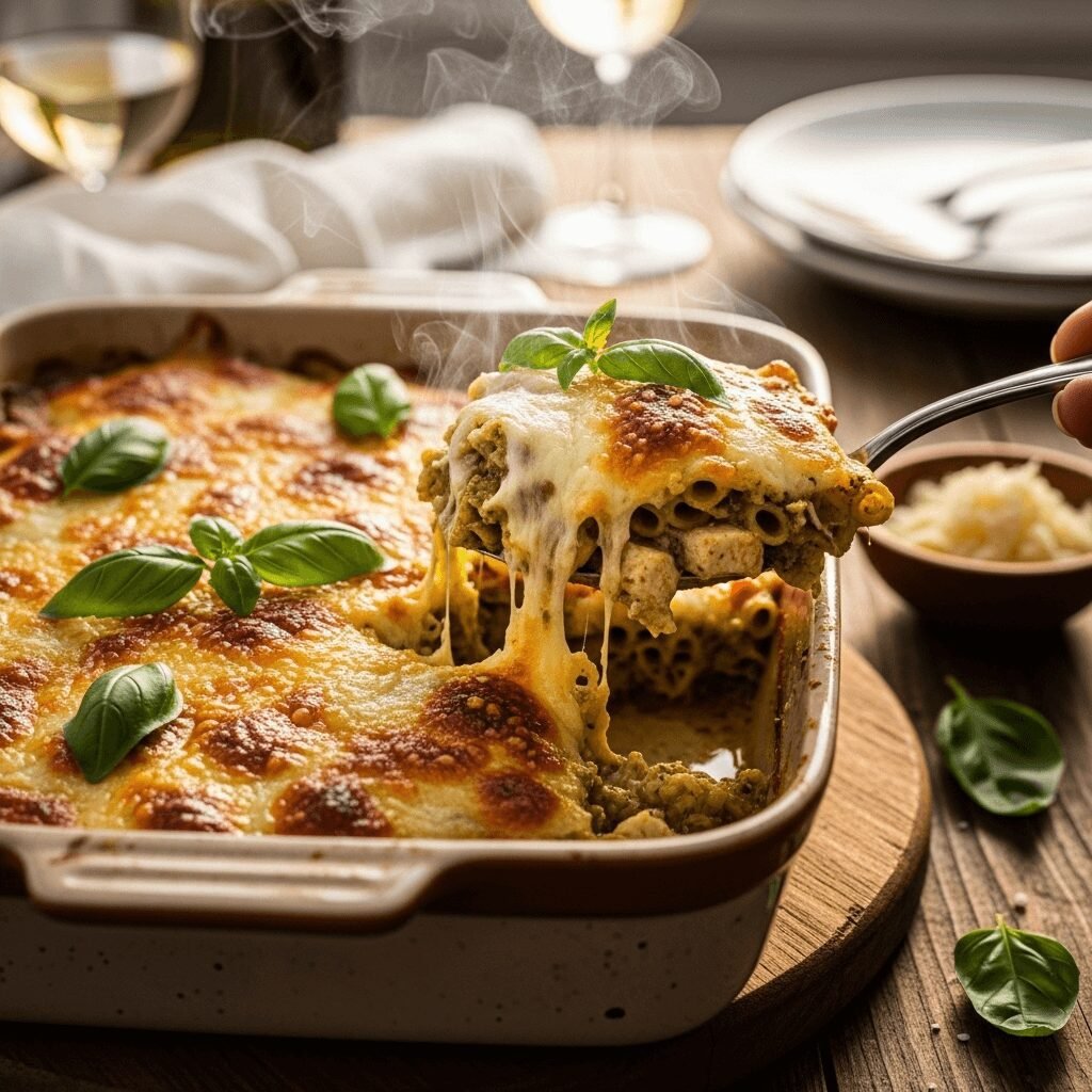 The concept of combining pasta with sauce and cheese, then baking it until golden and bubbly, became popular in America during the mid-20th century when Italian-American cuisine began flourishing. Home cooks embraced these recipes because they were economical, could feed a crowd, and could be prepared ahead of time—a revolutionary concept for busy families. The addition of chicken and pesto to the traditional pasta bake is a more modern American twist that reflects our love for protein-packed, flavor-forward meals.
