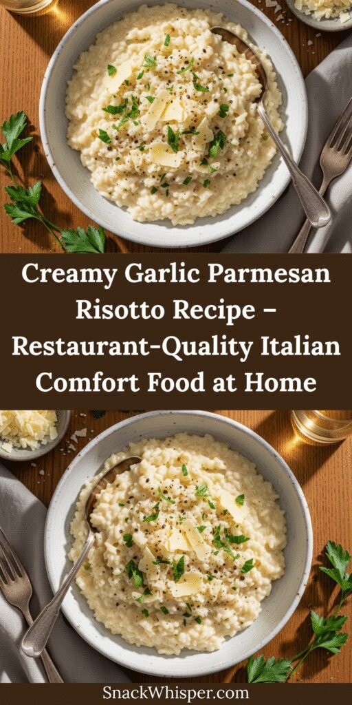 This Creamy Garlic Parmesan Risotto is restaurant-quality Italian comfort food made easy at home. With its velvety texture, rich garlic flavor, and generous Parmesan coating, this classic risotto recipe transforms simple ingredients into an elegant dish perfect for weeknight dinners or special occasions.