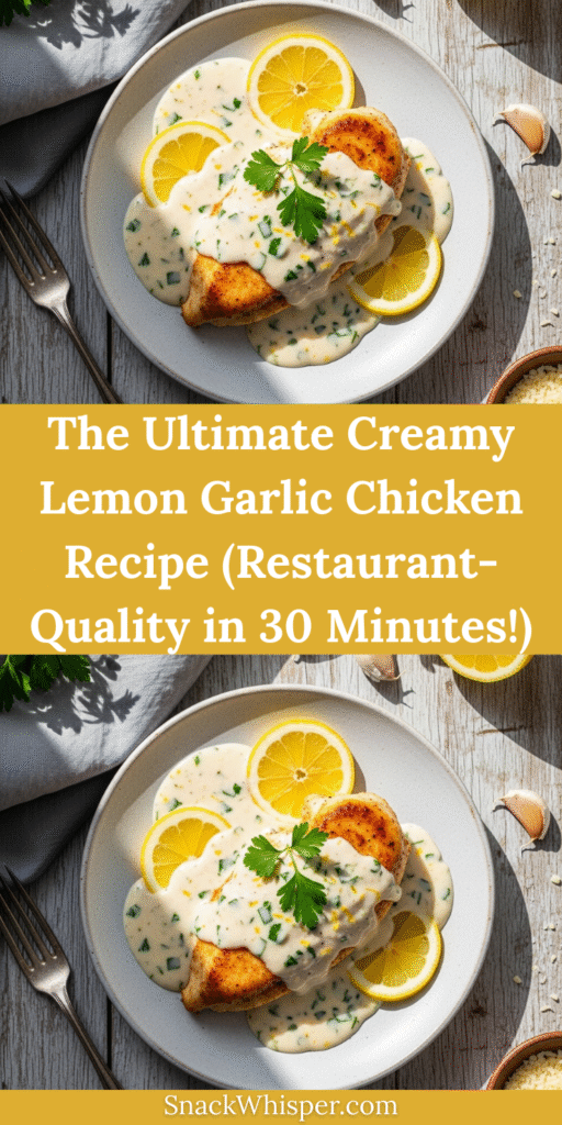 This Creamy Lemon Garlic Chicken features tender, golden-seared chicken breasts smothered in a rich, velvety cream sauce bursting with bright lemon flavor and aromatic garlic. Ready in just 30 minutes with one skillet, it’s the perfect weeknight dinner that tastes like restaurant luxury.