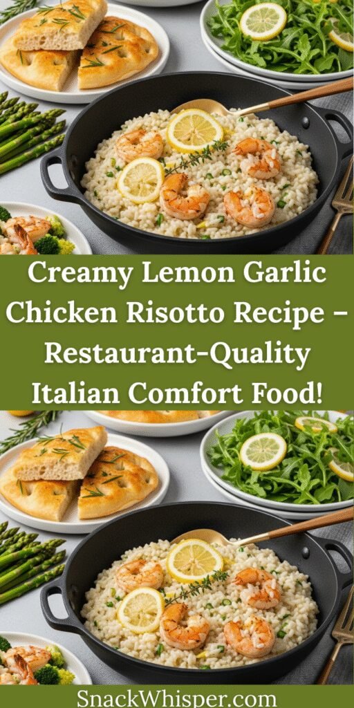 Protein Additions: While the risotto already contains chicken, you could serve additional protein on the side for heartier appetites. Grilled shrimp, pan-seared scallops, or grilled fish would all complement the lemon-garlic flavors beautifully for a luxurious surf-and-turf style meal.