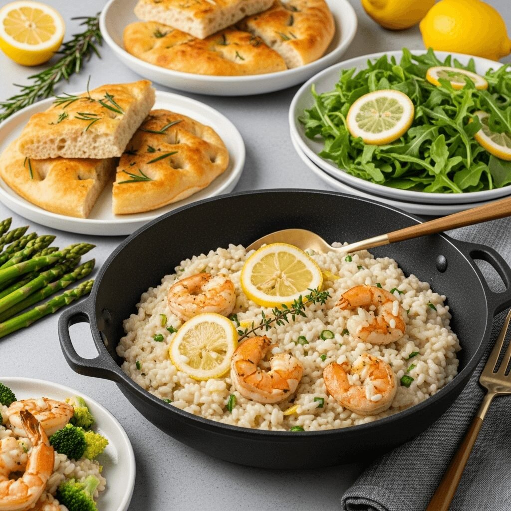 Roasted Vegetables: Roasted asparagus with shaved Parmesan complements the risotto without competing for attention. Roasted Brussels sprouts with balsamic glaze add caramelized sweetness and pleasant bitterness. Sautéed green beans with toasted almonds provide elegant crunch. Roasted cherry tomatoes burst with sweet-tart juice that brightens every bite.