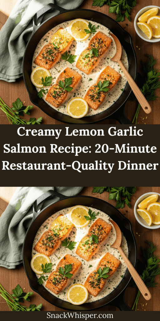This restaurant-quality creamy lemon garlic salmon features perfectly seared salmon fillets swimming in a luxurious cream sauce infused with bright lemon, aromatic garlic, and white wine. Ready in just 20 minutes, this one-pan wonder delivers impressive flavor with minimal effort, making it perfect for both weeknight dinners and special occasions.