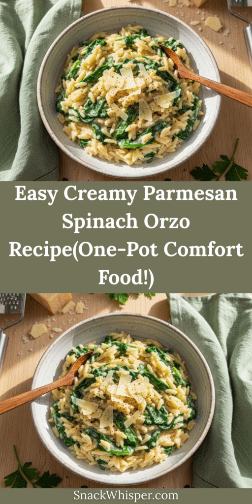 There you have it – the ultimate creamy Parmesan spinach orzo recipe that’s destined to become a regular rotation in your dinner plans! This one-pot wonder delivers incredible flavor, restaurant-quality presentation, and comforting creaminess without requiring hours in the kitchen or a sink full of dishes. Whether you’re serving it as an elegant side dish for Sunday dinner, meal-prepping for the busy week ahead, or turning it into a quick vegetarian main course, this orzo never disappoints.