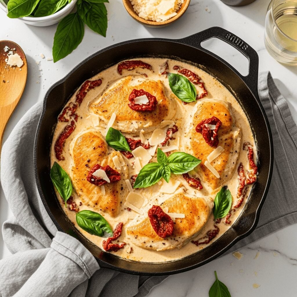 This Creamy Sun Dried Tomato Chicken features tender, pan-seared chicken breasts swimming in a rich, garlicky cream sauce loaded with tangy sun-dried tomatoes, fresh basil, and Parmesan cheese. It’s an easy one-pan dinner that tastes like it came from an Italian restaurant, ready in just 30 minutes!
