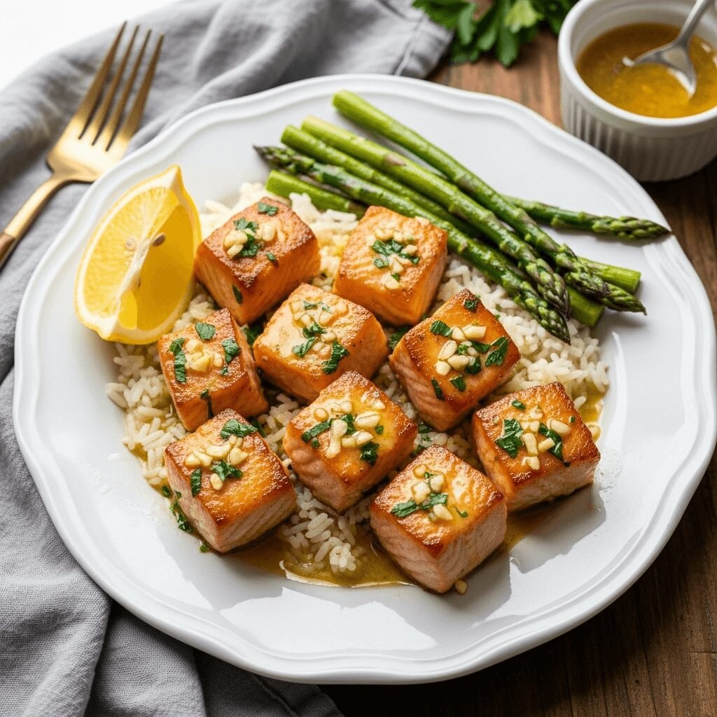 Pasta Dishes: Toss the salmon bites with linguine, fettuccine, or penne and extra garlic butter sauce for an elegant pasta dinner. Add cherry tomatoes and spinach for color and nutrition. The butter sauce naturally coats the pasta beautifully.