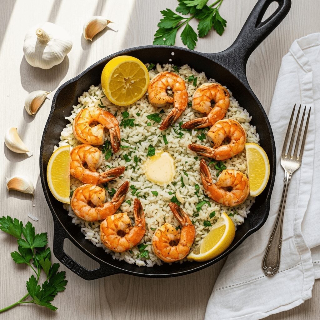 Partial Cook-Ahead: Cook the rice completely up to 2 days in advance, then store refrigerated. When ready to serve, cook the shrimp fresh and reheat the rice gently in the skillet with the garlic butter before combining.
