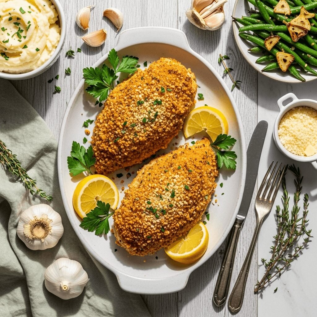 Juicy chicken breasts coated in a crispy, golden crust of Parmesan cheese, breadcrumbs, and garlic. This baked chicken is healthier than fried but delivers all the crunch and flavor you crave. Perfect for weeknight dinners or special occasions.